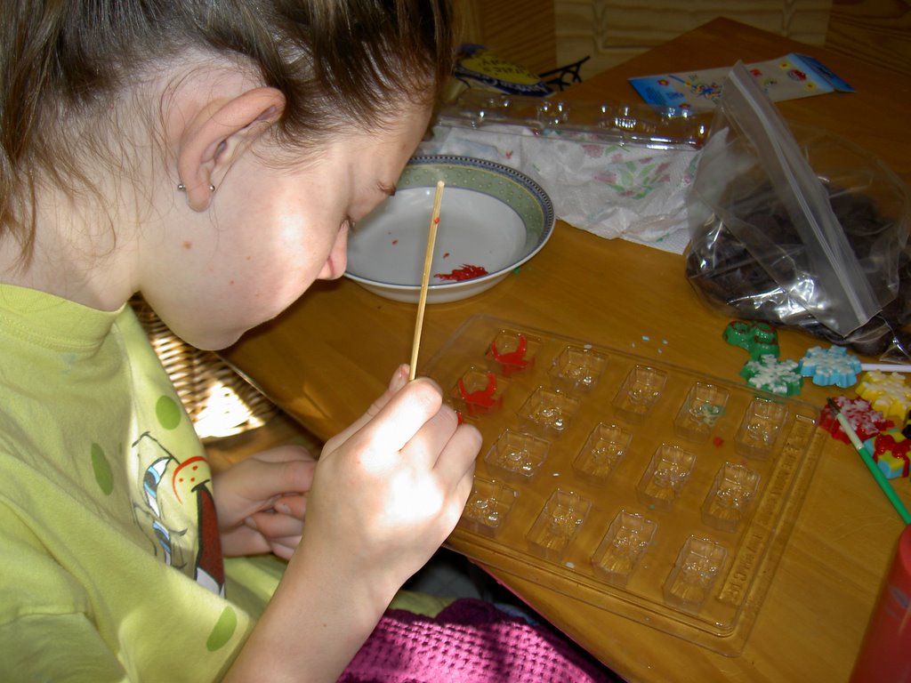 Then the fun finally began. KT was so deliciously meticulous about getting her candy just right. She used small paint brushes, bamboo skewers and squeeze bottles to do her work. Naturally, her father kept stopping by the table trying to eat some of the masterpieces. Not because he actually liked candy, but because he knew it would drive KT nuts. She told him time and again that she would make one for him later.